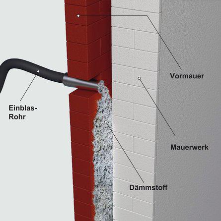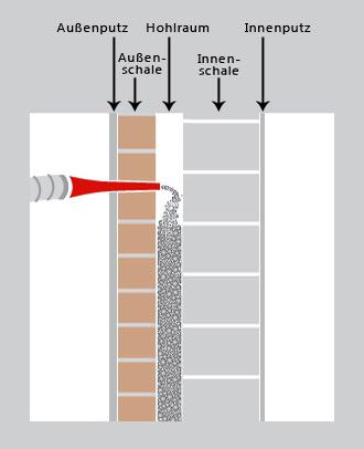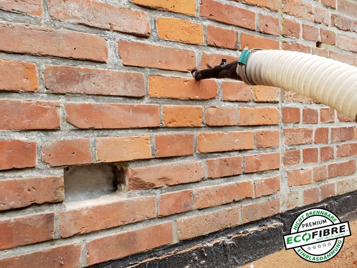 Wir nutzen moderne Einblasverfahren: Durch kleine Bohrungen wird das Dammmaterial in den Hohlraum der Wand eingeblasen, sodass eine lückenlose und effektive Isolierung entsteht.